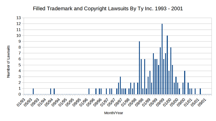 Here is a Graph showing an attempt of documenting every Copyright and Trademark Lawsuit Ty filed during the Beanie Baby Craze. You can see the list of lawsuits here.